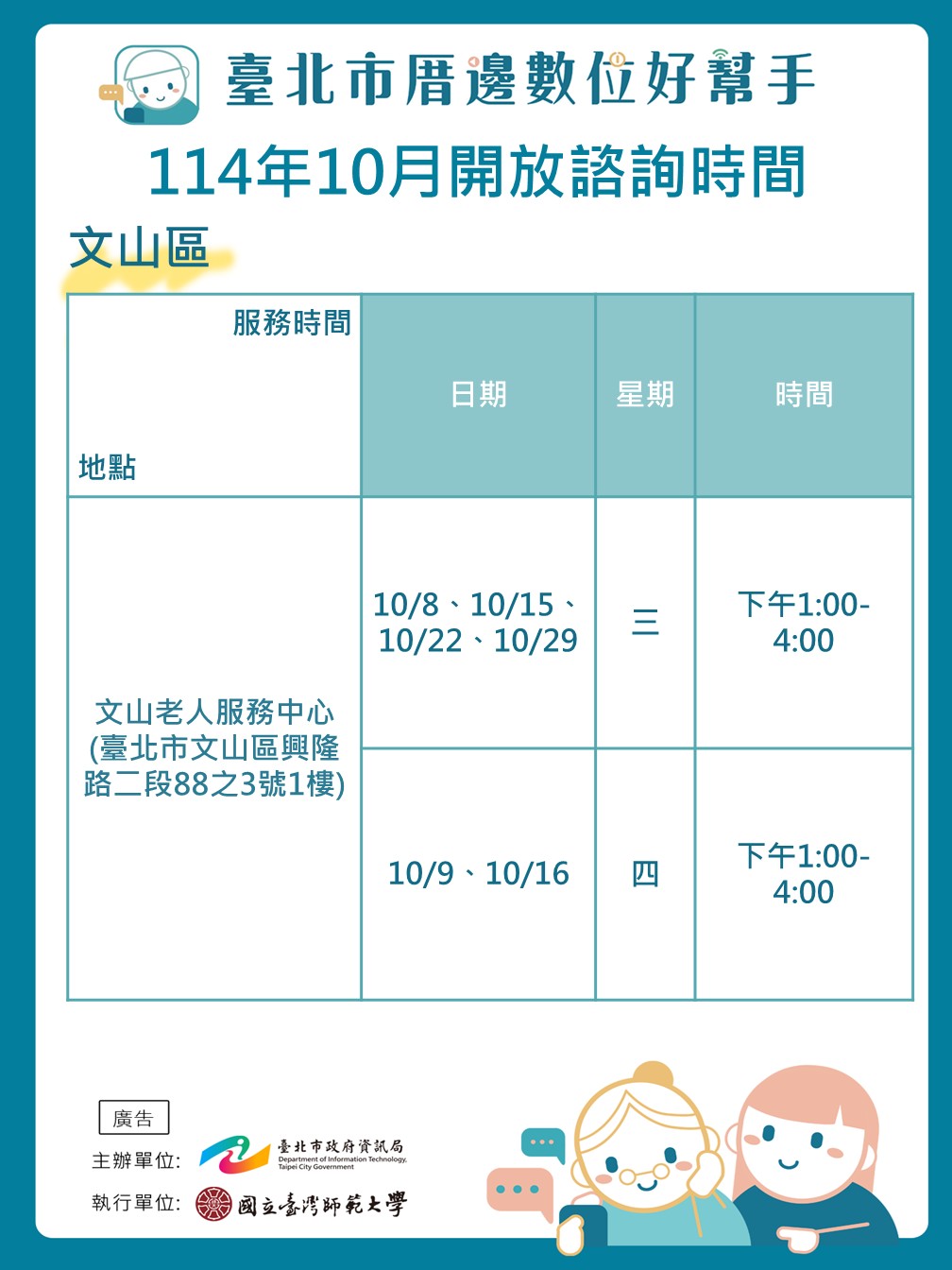 厝邊數位好幫手 10月駐點時間 2025-10-01 #數位好幫手 10月繼續為大家服務! 中心【每週三、週四下午13:00~16:00】(*日期請參下圖)都有專業的好幫手來幫大家解惑各項3C問題~ #歡迎發問各種3C問題 而且還是 #免費 !! 大家不要錯過這個增進 #數位資訊能力的機會 – 諮詢地點:臺北市文山區興隆路二段88之3號1樓[書報區] Ps.小幫手都會設置好明顯的看板,不用擔心找不到她們~ #3C問題不要怕#來找厝邊數位好幫手 #提升資訊能力