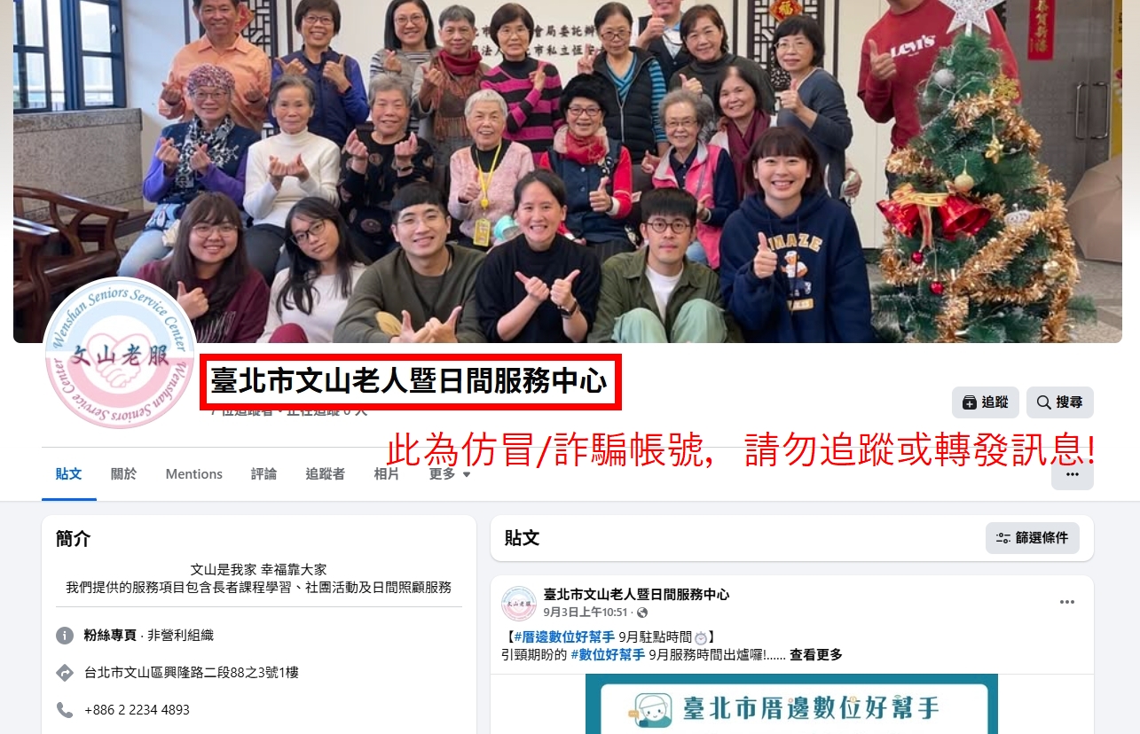 嚴禁仿冒!杜絕詐騙 2025-09-05 近年來詐騙案件猖獗! 就連近日中心也發現有人冒用中心名義創立假冒粉絲專頁 *請所有支持我們的好朋友們一起導正視聽* 若有任何疑慮,都歡迎來電諮詢 電話:02-2234-4893 讓我們一起成為能夠聰明識別詐騙的閱聽人
