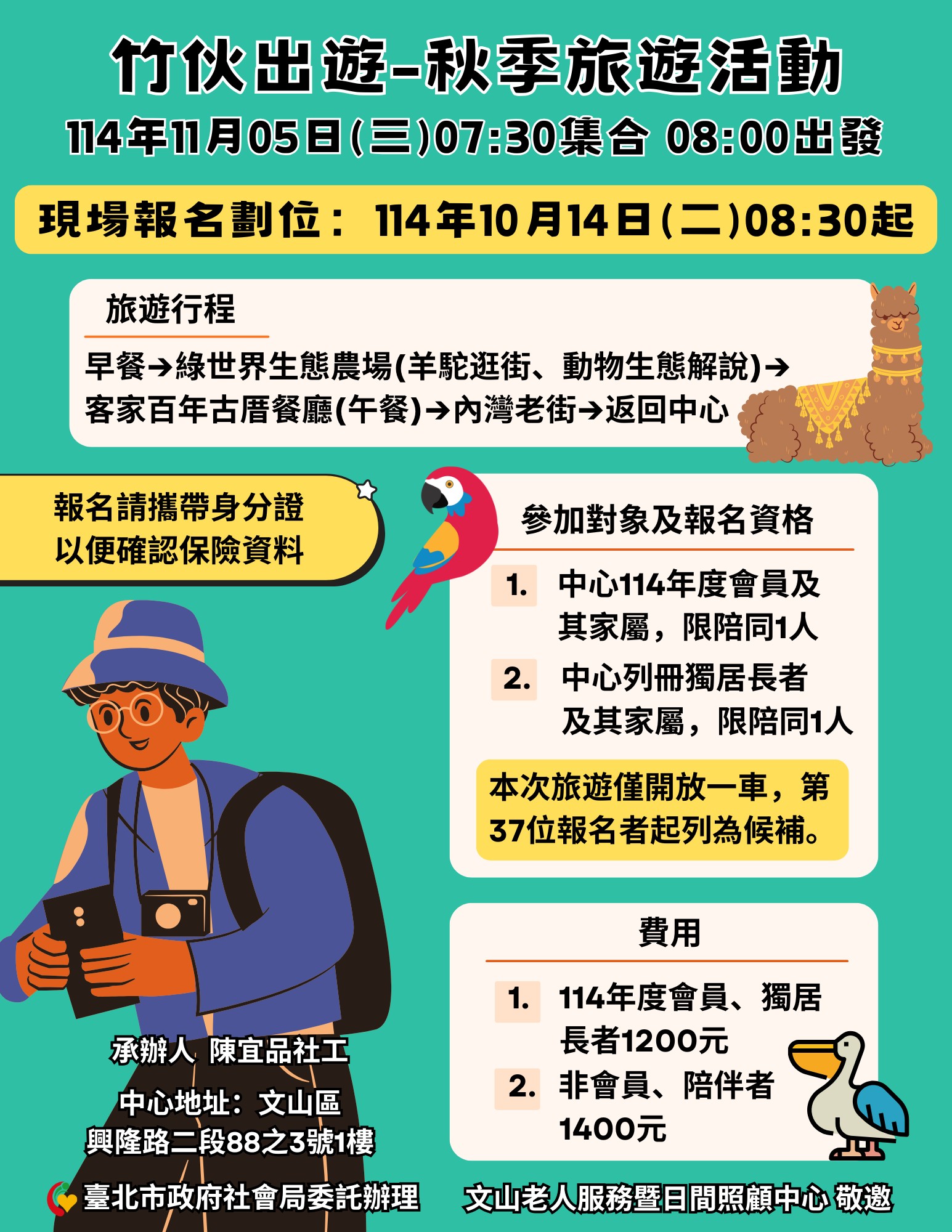 旅遊時間:114年11月5日(三)07:30於中心集合,08:00準時出發